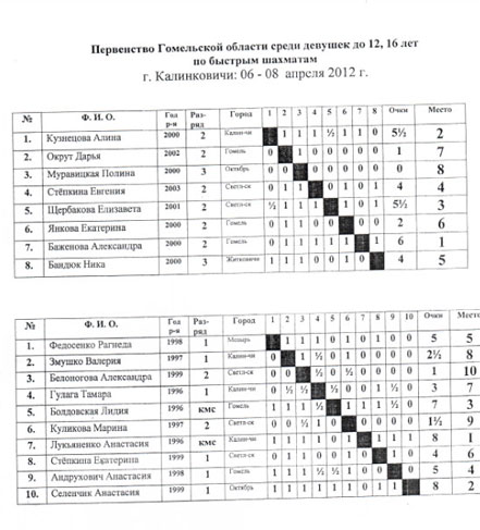 У девушек был круговик. До 12 лет первое место с 6 очками у Баженовой Александры из Гомеля, второе с 5,5 очками у Кузнецовой Алины из Калинкович, третье с 5,5 — Щербаковой Елизаветы из Светлогорска.