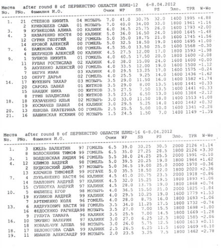 В блице до 12 лет места распределились соответственно занятым местам следующим образом: Степнов Никита из Мозыря, Кривошеев Александр из Мозыря, Назаренко Константин из Калинкович.