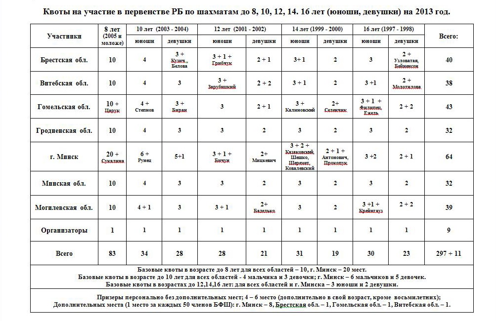 Квоты на участие в первенстве РБ по шахматам до 8, 10, 12, 14. 16 лет (юноши, девушки) на 2013 год