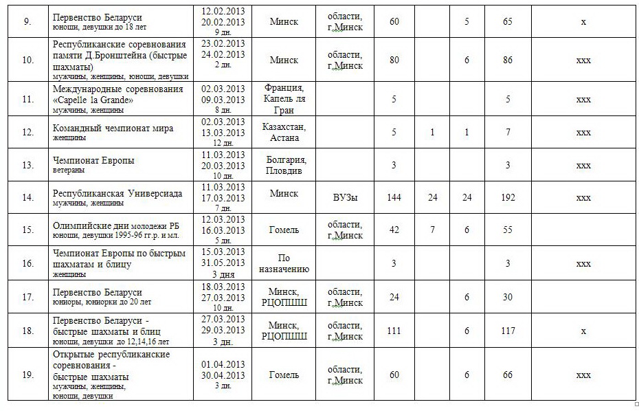 Республиканский календарный план проведения официальных спортивных соревнований, учебно-тренировочных сборов и участия национальных и сборных команд Республики Беларусь по шахматам в международных мероприятиях на 2013 год.