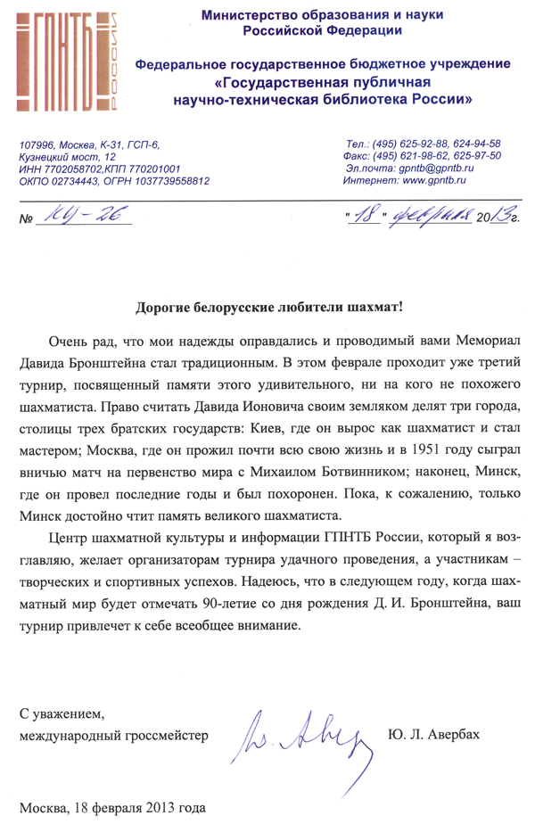 В ОО "Белорусская федерация шахмат" пришло очень теплое письмо от старейшего гроссмейстера мира Юрия Львовича Авербаха.