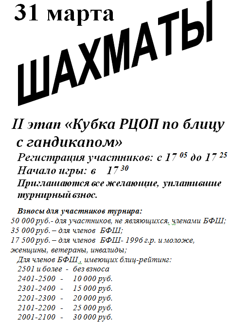 31 марта в столичном РЦОПе пройдет II этап «Кубка РЦОП по блицу с гандикапом».