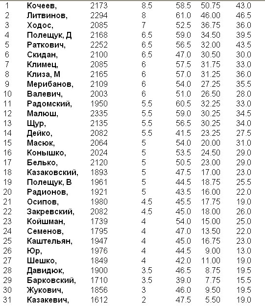 К. Ступак, А. Кочеев, В.Мерибанов, М.Клиза, В.Ковалев, Ел.Хомякова, М. Элькин, И.Раткович, В. Литвинов и Д.Трифонов — 10 лучших среди мужчин (Заблоцкий — гость из России отказался от участия).