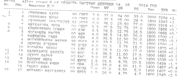 В возрастной группе от 14 лет до 16 лет проводился общий турнир у девушек. У девушек до 16 лет с 7,5 очками победителем стала Степкина Екатерина из Светлогорска, второе место у девушек до16 лет и первое у девушек до 14 лет у Степкиной Евгении из Светлогорска, третье место с 6,0 очками у девушек до 16 лет досталось Селенчик Анастасии из Октябрьского.