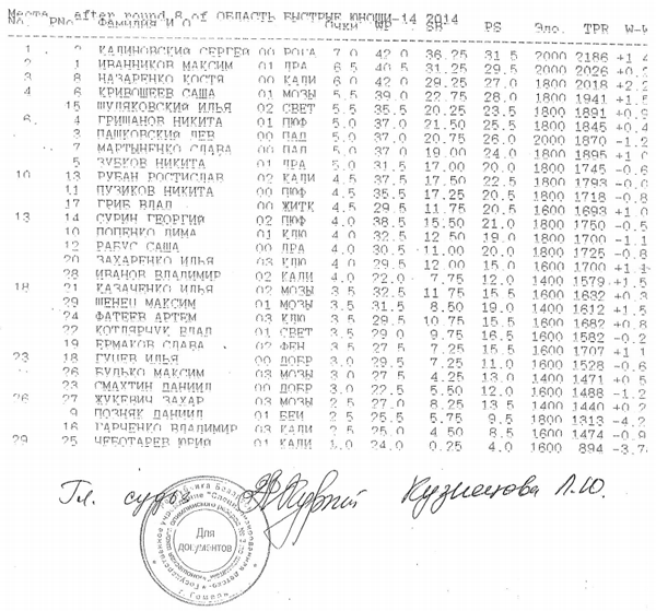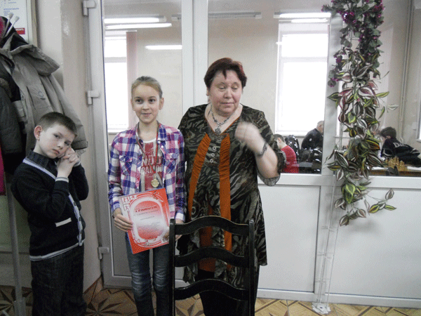 У юношей до 14 лет первое место с 7очками занял Калиновский Сергей из Рогачева. Второе-у Иванникова Максима (6,5) из Гомеля. Третье с 6,0 очками у Назаренко Константина из Калинкович.