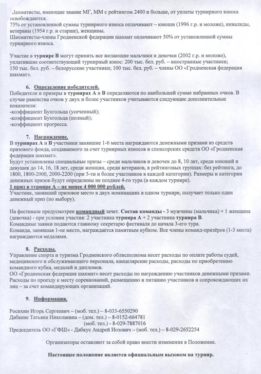 Внимание участников и гостей шахматного фестиваля "Гродно-Опен-2014"!!! Изменилось место проведения фестиваля: регистрация, турниры А и В, блиц- и темпо-турниры пройдут на базе УО "Гродненский государственный аграрный университет" в помещении учебного корпуса №5 (ул. Терешковой, 18). Организаторы приносят свои извинения.Текущие результаты турнира "А"
