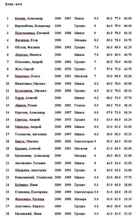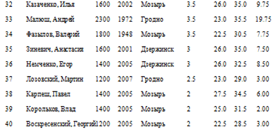 23 Бутелевич, Евгений 1400 2004 Гродно 3.5 29.5 36.0 8.00