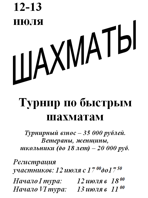 12-13 июля в столичном РЦОПе (ул.К.Маркса, 10) пройдет турнир по быстрым шахматам. Приглашаются все желающие.