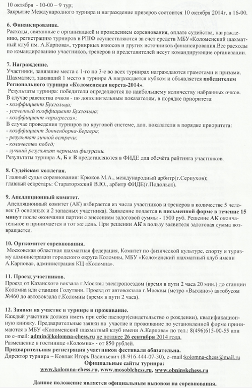 С 4 по 10 октября в г.Коломна пройдет очередной международный шахматный фестиваль "Коломенская верста-2014". В программе фестиваля: турнир с нормой международного мастера, открытый чемпионат Московской области среди мужчин и открытый турнир среди юношей и девушек 2000 г.р. и моложе с раздельным зачетом.