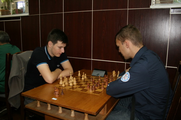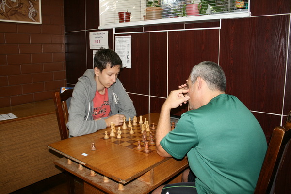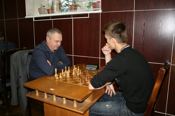 Сергей Каспаров перед началом турнира спросил, почему я в своих статьях совсем не жалую блиц. Помните, когда-то были очень популярны короткометражные фильмы. Вроде фильм, но не совсем. Не успеешь понять смысл, глядишь — а он уже закончился. Шедевры, сыгранные в классике — вечный мрамор, не чета этим ледяными песочным скульптурам. Ну разве можно назвать это серьезным делом, если некоторые игроки вытворяют такое: 1.a2-a3? С одной стороны, это же не шахматы, ну, не совсем шахматы, а, с другой стороны быстрая игра так завораживает, что глаз нельзя оторвать, да и градус напряжения очень высок. Вот некоторые не рискуют с ходу сесть и играть в блиц. Здесь требуются совсем иные «навороты»: «ручная» реакция, скорость мышления, дружеские отношения с цейтнотом и отключение эмоций, ибо «эмоции вредят чистому разуму» (кажется, верно процитировала Шерлока Холмса). Но оставим эту словесную эквилибристику и перейдем к оглашению результатов «короткометражного» блица (3+2 сек. на ход).1-3 места с одинаковым количеством очков (7.5) разделило неожиданное трио в лице Валентина Ежеля (1 место, Гомель),Сергея Каспарова (2 место, Могилев) и Алексея Андросюка (3 место, Кобрин).