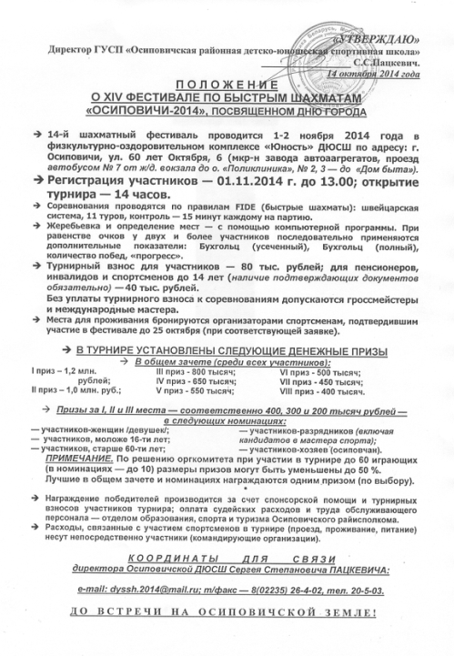 1-2 ноября в физкультурно-оздоровительном комплексе "Юность" ДЮСШ по адресу г.Осиповичи, ул. 60 лет Октября, 6 пройдет XIV Фестиваль по быстрым шахматам "Осиповичи-2014" посвященный Дню Города.