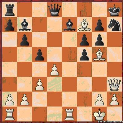1.e4c5 2.f4 Кc6 3.Кf3 g6 4.g3 Сg7 5.Сg2 e6 6.0-0 Кge7 7.Кc3 d5 8.e5 закрытый вариант сицилианской защиты 8 a6 9.d3 b5 10.Фe2 Фa5 11.Кd1 c4 ? рано. Этим ходом черные предлагают белым укрепить цепь d4-e5 [проще было 11 0-0] 12.d4 Фb6 13.Фf2 h5 попытка заторможения атаки на королевком фланге 14.h3 a5 15.g4 h:g4 16.h:g4 Сa6 17.c3 0-0-0 ?! черные убежали от атаки на короля, но слабые пункты остались [можно было начинать свою игру 17 b4 18.a3 b:c3 19.b:c3 a4 20.Лa2 Кa5 21.Кe3 Кb3] 18.Сe3 b4 19.Кh4 Сh6 20.f5 С:e3 21.К:e3 g:f5 22.g:f5 Лdf8 ? медленный ход [нужно было занять свободную линию 22 Лdg8 23.Лad1 Крb7] 23.f6 Кg8